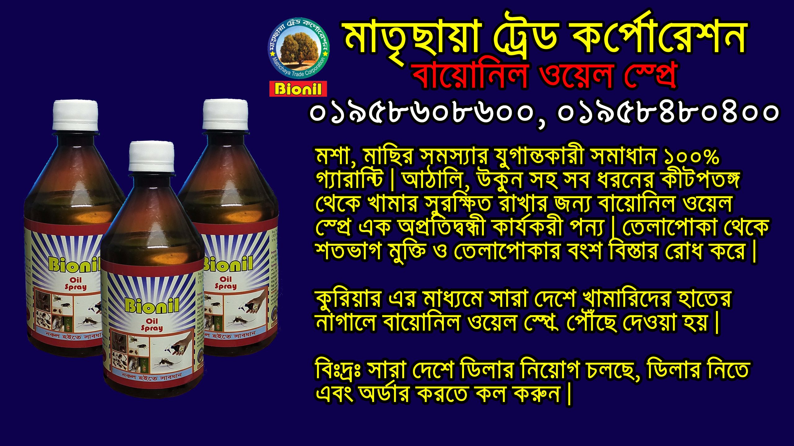 মাতৃছায়া ট্রেড কর্পোরেশনের বায়োনিল ওয়েল স্প্রে হালকা ঝাঁকিয়ে স্প্রে করার সাথে সাথেই মশা,মাছি,ছারপোকা সহ যে কোন ধরনের অমেরুদন্ডী পোকামাকড় নিমিষেই হবে ধ্বংস।